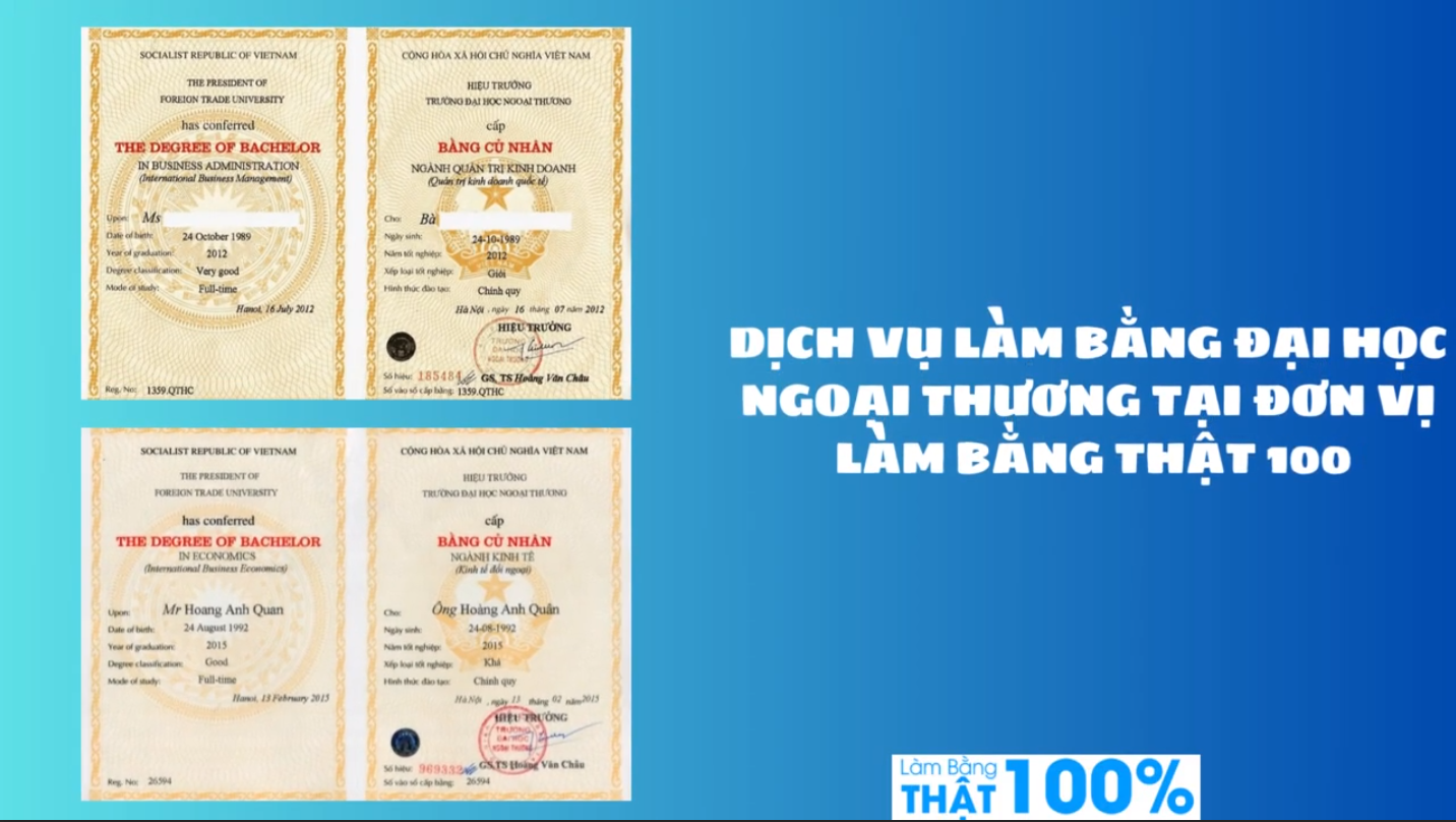 Làm Bằng Đại học Ngoại thương – còn được gọi là “Harvard Việt Nam”, luôn là một ước mơ của nhiều bạn học sinh. Tuy nhiên, không phải ai cũng có cơ hội được học tại ngôi trường này vì nhiều lý do khác nhau. Vậy nếu bạn muốn sở hữu một bằng cấp Đại học Ngoại thương, bạn cần làm gì? Hãy cùng Làm Bằng Thật 100 tìm hiểu về vấn đề này trong bài viết dưới đây.