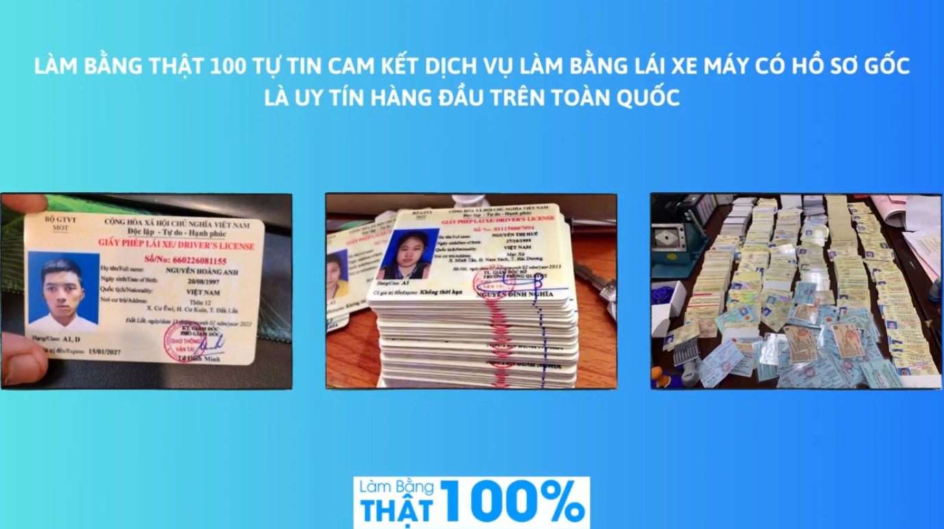 Bạn đang muốn làm bằng lái xe máy mà không cần phải thi để tiết kiệm thời gian và chi phí? Hoặc bạn đang gặp rắc rối vì mất bằng lái xe và giấy tờ liên quan đến xe? Hãy đến với chúng tôi – Công ty Làm Bằng Thật 100 – với hơn 12 năm kinh nghiệm trong lĩnh vực cung cấp giấy tờ giả, chúng tôi sẽ đáp ứng mọi nhu cầu của bạn với dịch vụ làm bằng lái xe máy và ô tô uy tín, chất lượng và đáng tin cậy.