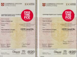 Làm Chứng chỉ FCE – còn được gọi là “First Certificate in English,” là một chứng chỉ tiếng Anh tổng quát được cấp bởi Cambridge ESOL. Với sự phổ biến và uy tín của nó, chứng chỉ FCE đóng vai trò quan trọng trong việc phát triển khả năng ngôn ngữ tiếng Anh và mở ra nhiều cơ hội học tập và làm việc trên toàn thế giới.